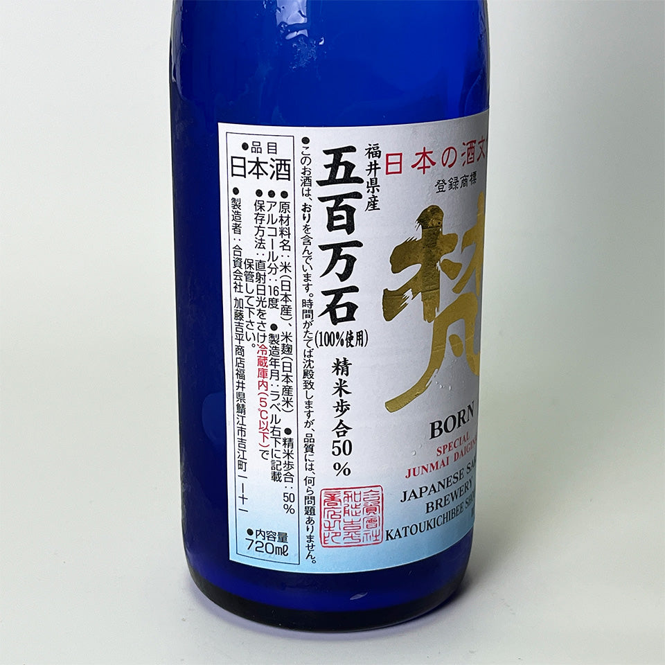 Specific name, etc.: Junmai Daiginjo / ALC (%): 16.0 / Main ingredient: Gohyakumangoku / Rice polishing ratio (%): 50 / Yeast: / Sake meter value: / Acidity: / Amino acid content: / Brewing year: 2024
