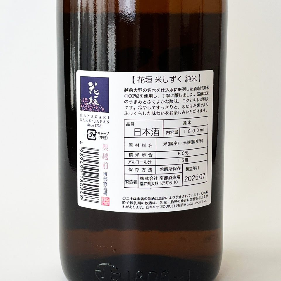This brewery was founded in 1733 (the 18th year of the Kyoho era) and is located in Ono City, Fukui Prefecture. Its flagship brand is "Hanagaki." Its philosophy is to "devote itself to handcrafting, carefully brew small quantities that can be monitored, and bring higher quality sake to the world," and it specializes in junmai sake.