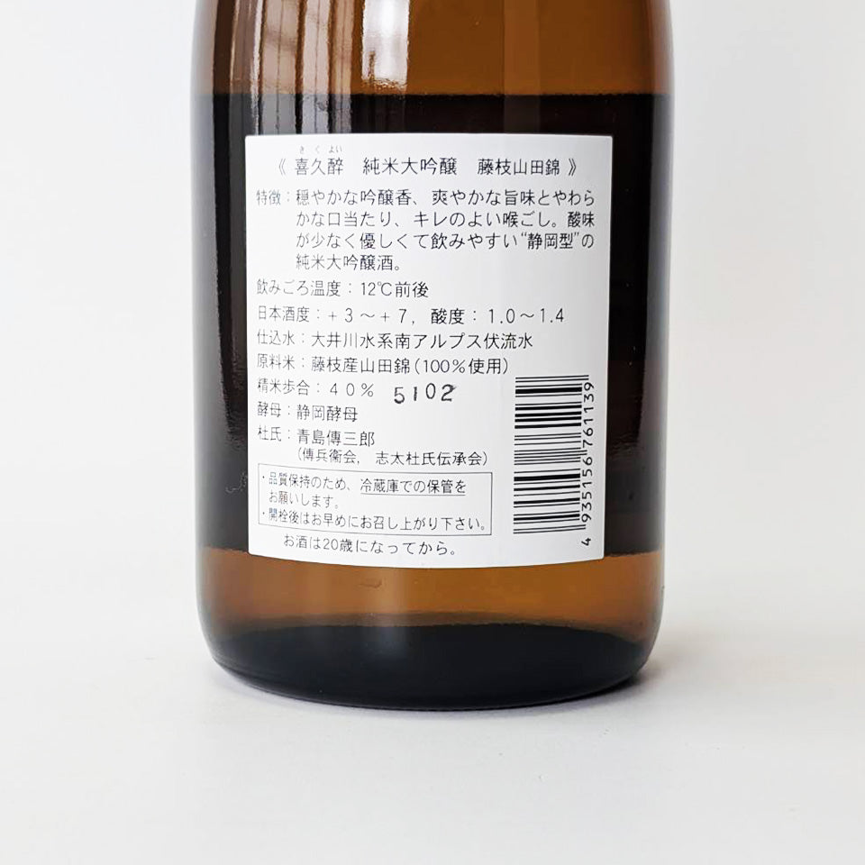 This Junmai Daiginjo is made with Yamadanishiki rice grown in Fujieda City, polished to 40%. It has a gentle ginjo aroma, a refreshing flavor, a soft mouthfeel, and a clean finish. It has a mild acidity and is easy to drink, making it a truly Shizuoka-style Junmai Daiginjo.