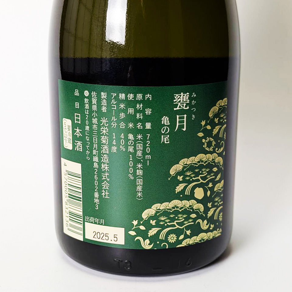 "Mikatsuki" is a highly refined sake from the Kame no O series. It is polished to 40% and aged at ice temperature. After bottling, each bottle is pasteurized (binkanhiiri) and then rapidly cooled using ice water, making it a sake that is worthy of being entered into a tasting competition.
