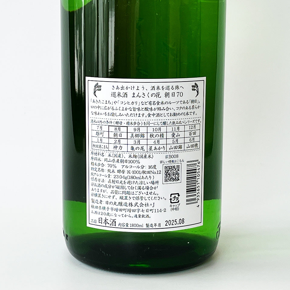 Specific name, etc.: Junmai / ALC (%): 16.0 / Main ingredient: Asahi / Rice polishing ratio (%): 70 / Yeast: / Sake meter value: 2.0 / Acidity: 1.8 / Amino acid content: 0.7 / Brewing year: 2024