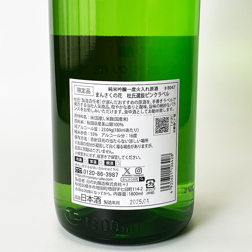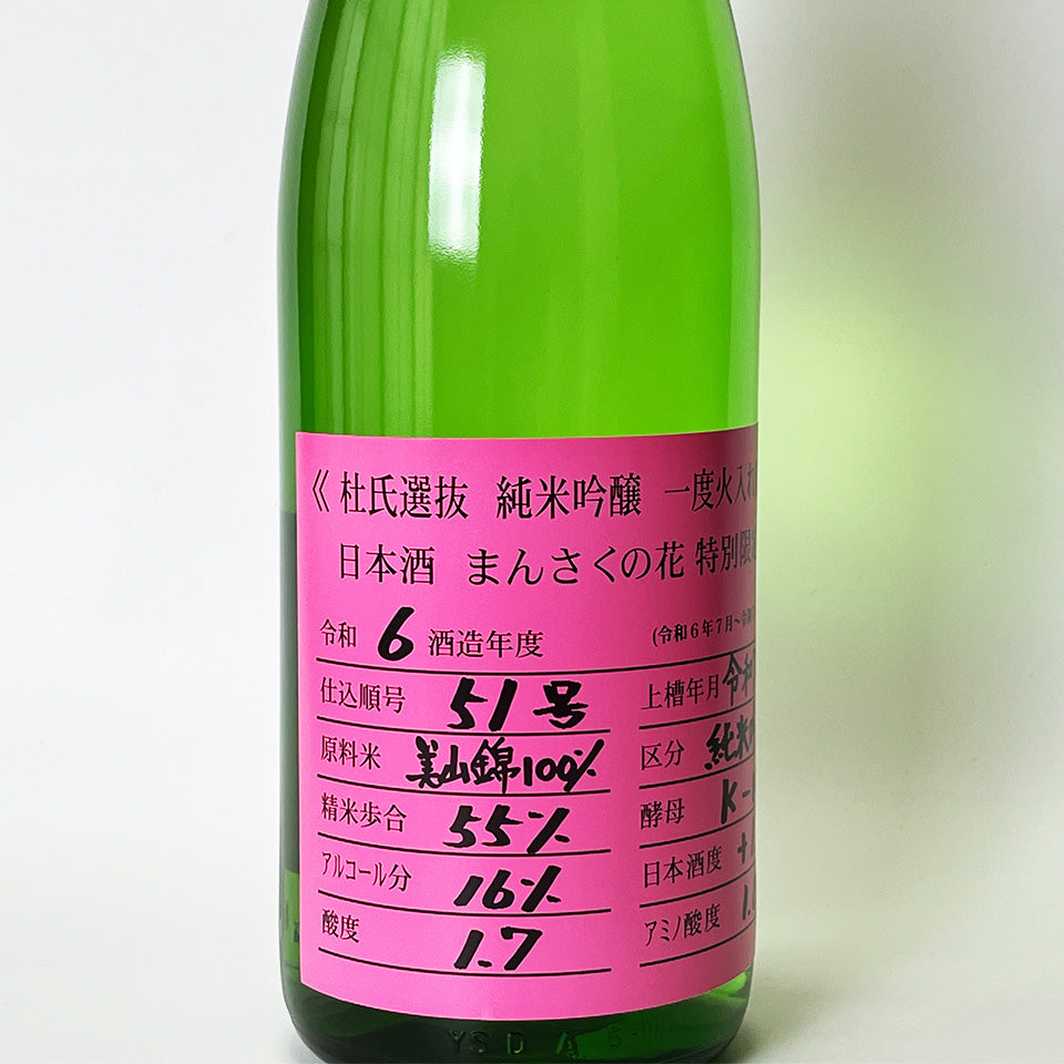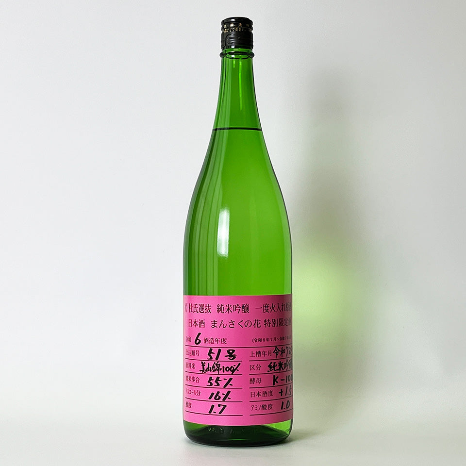 Mansaku no Hana Junmai Ginjo, Pasteurized, Unpasteurized, Selected by Toji, Pink Label (2024 brewing year)