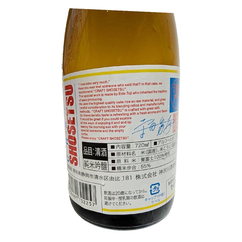 This brewery was founded in 1912 and is located in Yui, Shimizu Ward, Shizuoka City. Its flagship brand, "Shosetsu," named after the locally born military strategist Yui Shosetsu, uses soft water from the Kamisawa River, which flows down a steep mountain, and aims to produce a sake that you will never tire of, with a harmonious blend of five flavors - sweet, spicy, bitter, astringent, and sour - and an elegant, refreshing aroma.