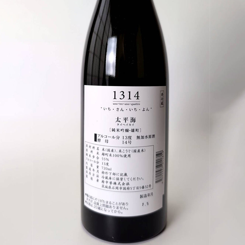 This Junmai Ginjo is made from Omachi rice, polished to 55% and pasteurized once. After pressing, it is bottled without any contact with oxygen. The "~1314" in the product name refers to the fact that the 13% alcohol content sake was brewed using Association No. 14 yeast.