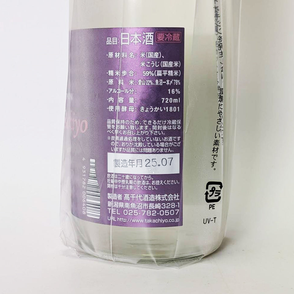 "Takachiyo" is a popular series brewed with sake-grade rice, polished to 59% and characterized by its fruity flavor. This product is a version made with two types of sake rice. The koji rice is Aiyama from Hyogo Prefecture, and the kakemai is Ippon-jime from Niigata Prefecture. This unfiltered sake has a subtle grape aroma.