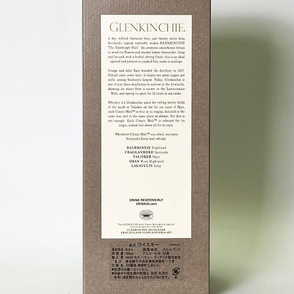 Founded in 1825, Glenkinchie Distillery is one of the few distilleries in the Lowlands, and produces the Edinburgh malt used as the base for Johnnie Walker. Distilled in one of Scotland's largest stills, it is characterized by a light, mild flavor, and this product is a single malt that has been aged for 12 years.