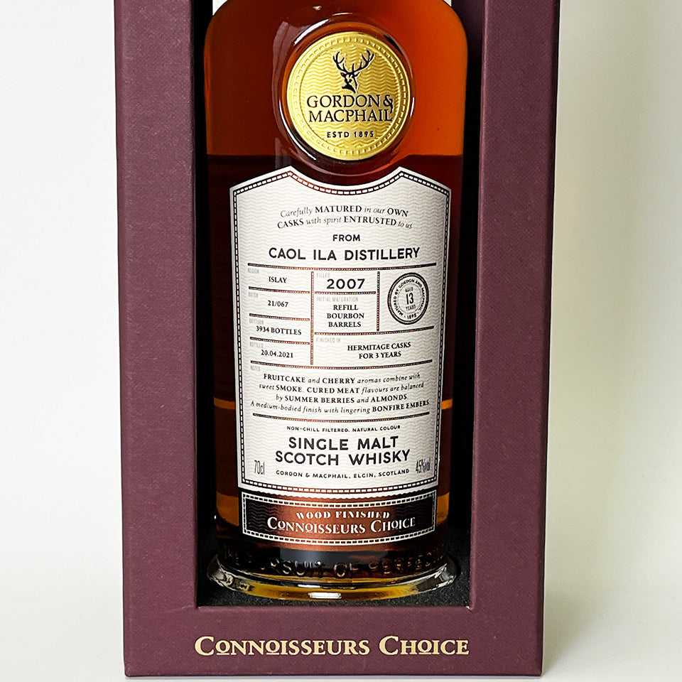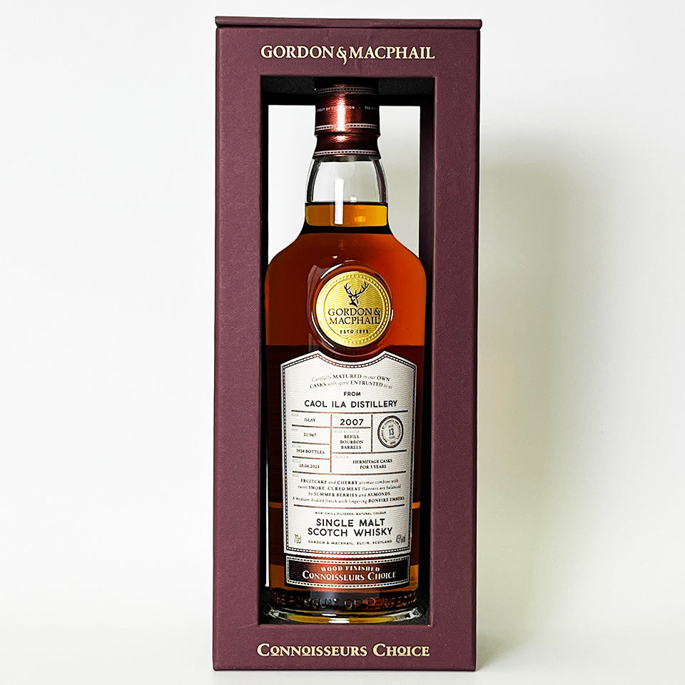 This is a rare "Wood Finish" from G&M's signature "Connoisseur's Choice" series. Distilled in 2007 at the Caol Ila distillery on Islay, it is a 13-year-old single malt that was aged in refill bourbon casks and finished in Hermitage casks.