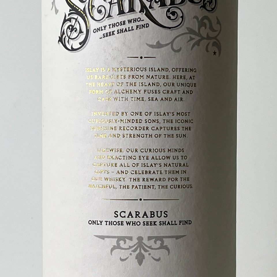 This product, "Scarabas," is named after a remote Islay region. The distillery and age of the blended whiskeys are not disclosed. It is a batch strength whiskey that was aged in refill bourbon casks and virgin American oak casks and bottled without adding water.