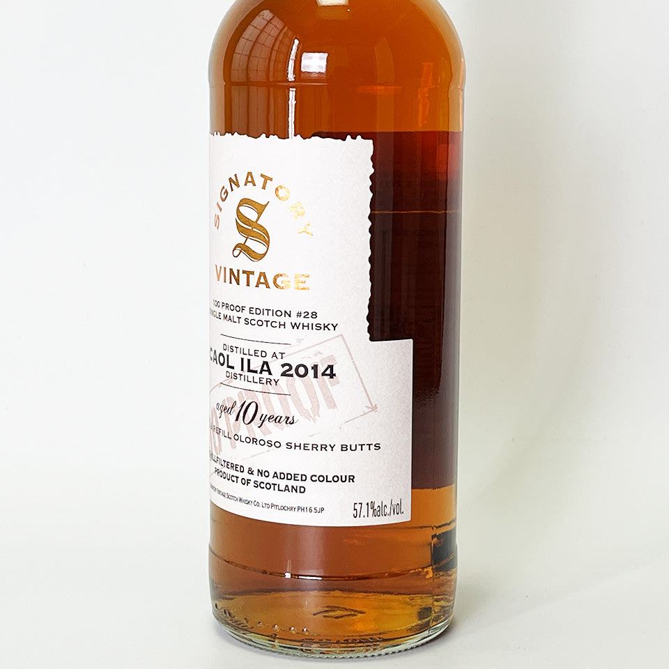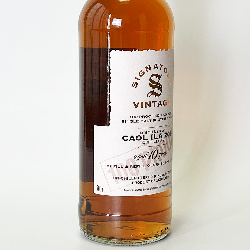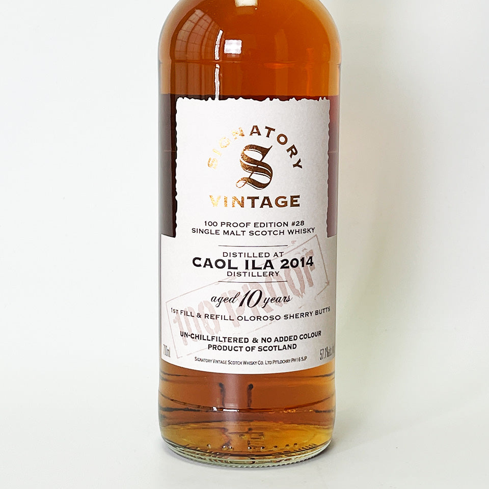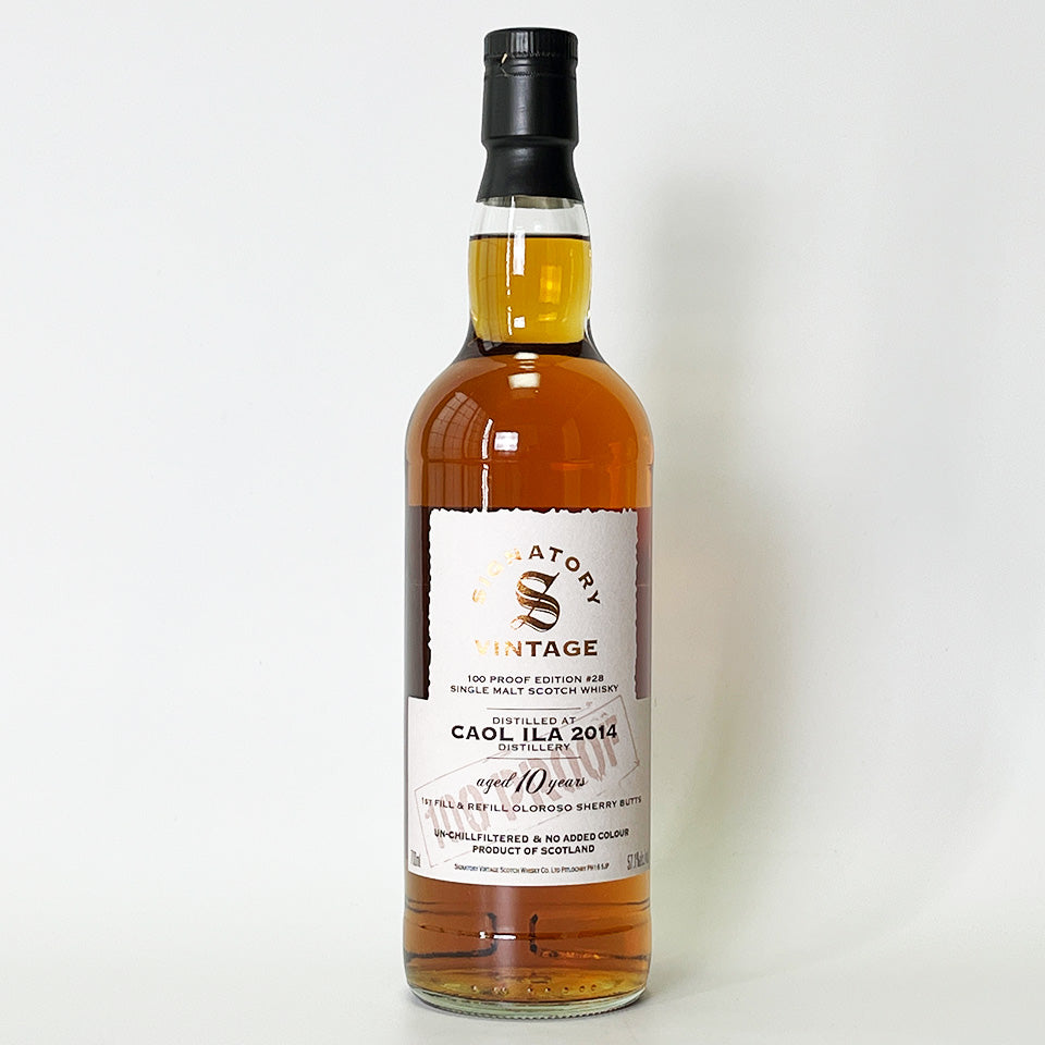 Signatory Vintage 100 Proof Series #28. This collection features malt from the Caol Ila Distillery on Islay, bottled at British 100 Proof (57.1% Alc.). This single malt was distilled in 2014 and then aged for 10 years in first-fill and refill Oloroso sherry butts. It is non-chill filtered and non-colored.