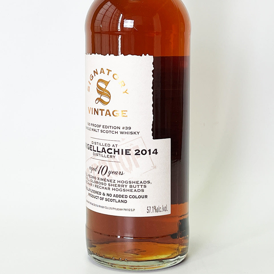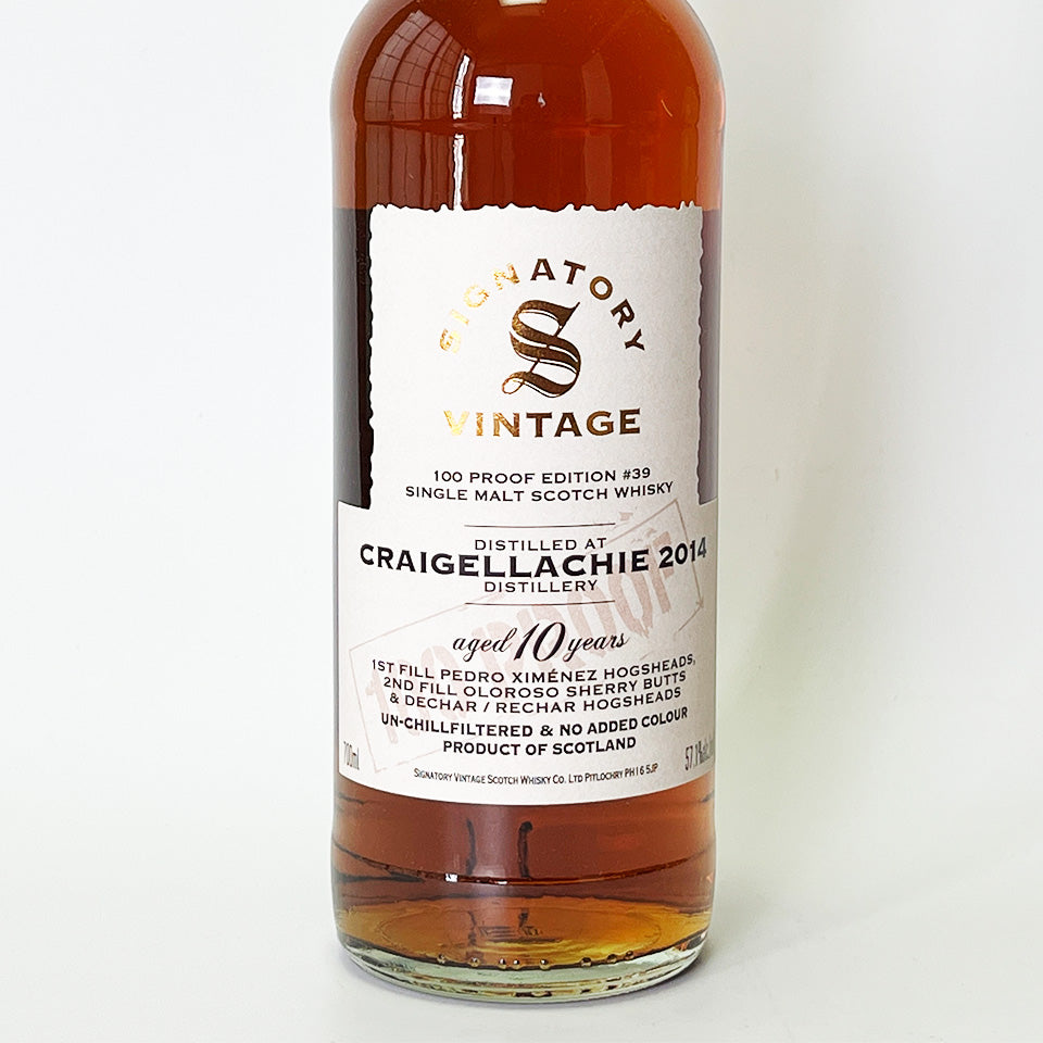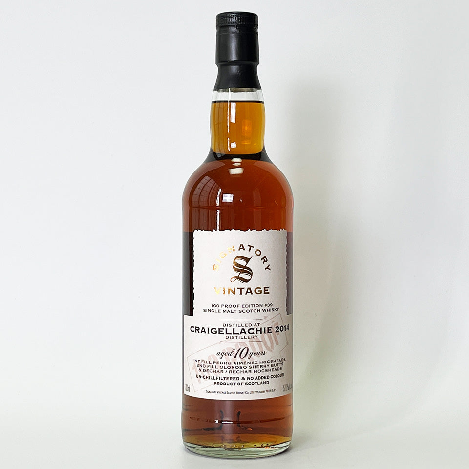 Signatory Vintage 100 Proof Series #39. This collection features malts from Craigellachie Distillery in Speyside, bottled at British 100 Proof (57.1% ABV). This single malt was distilled in 2014 and then aged for 10 years in a first-fill PX (Pedro Ximénez) sherry hogshead, a second-fill Oloroso sherry butt, and a Dicher/Richer hogshead. It is non-chill filtered and non-colored.