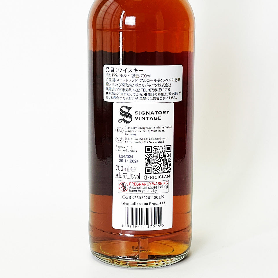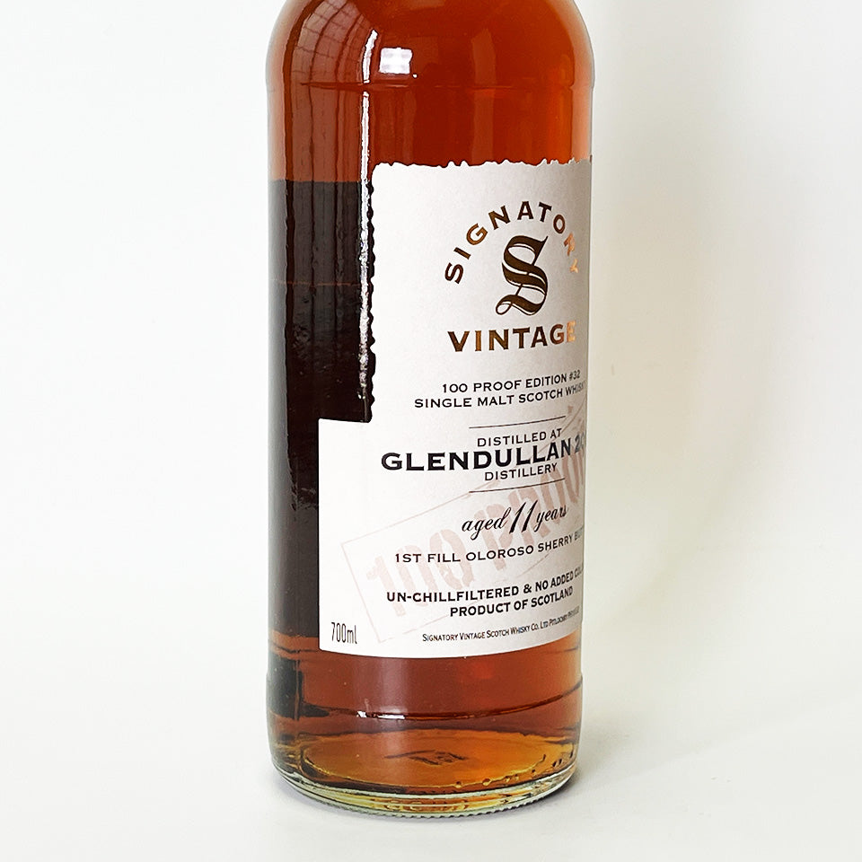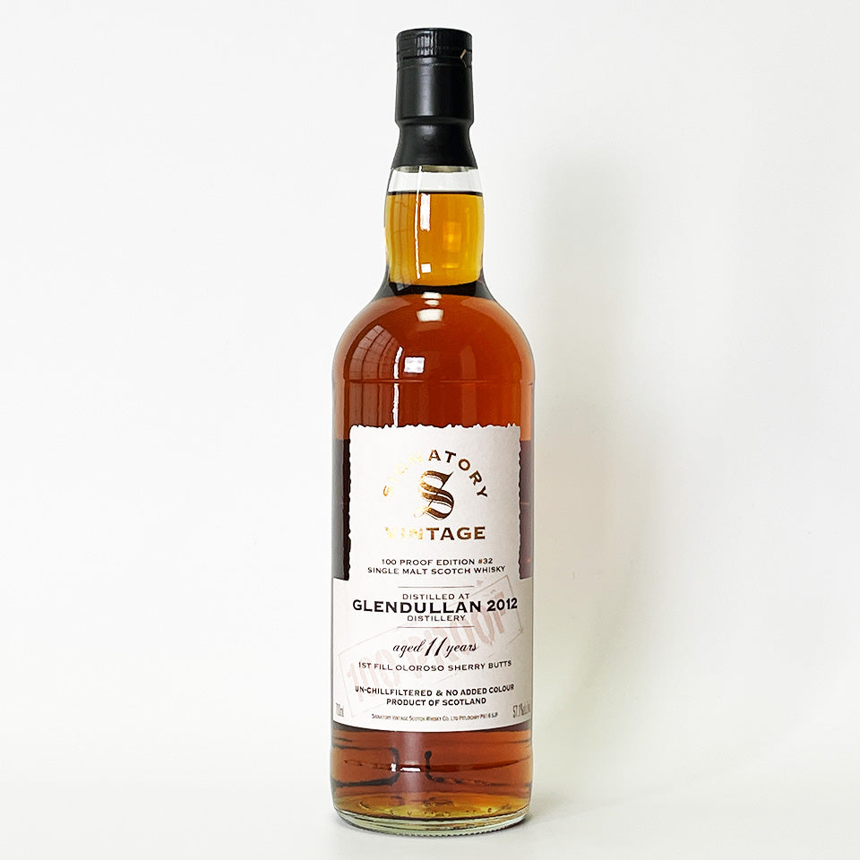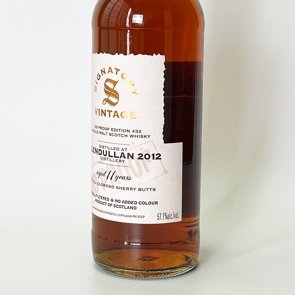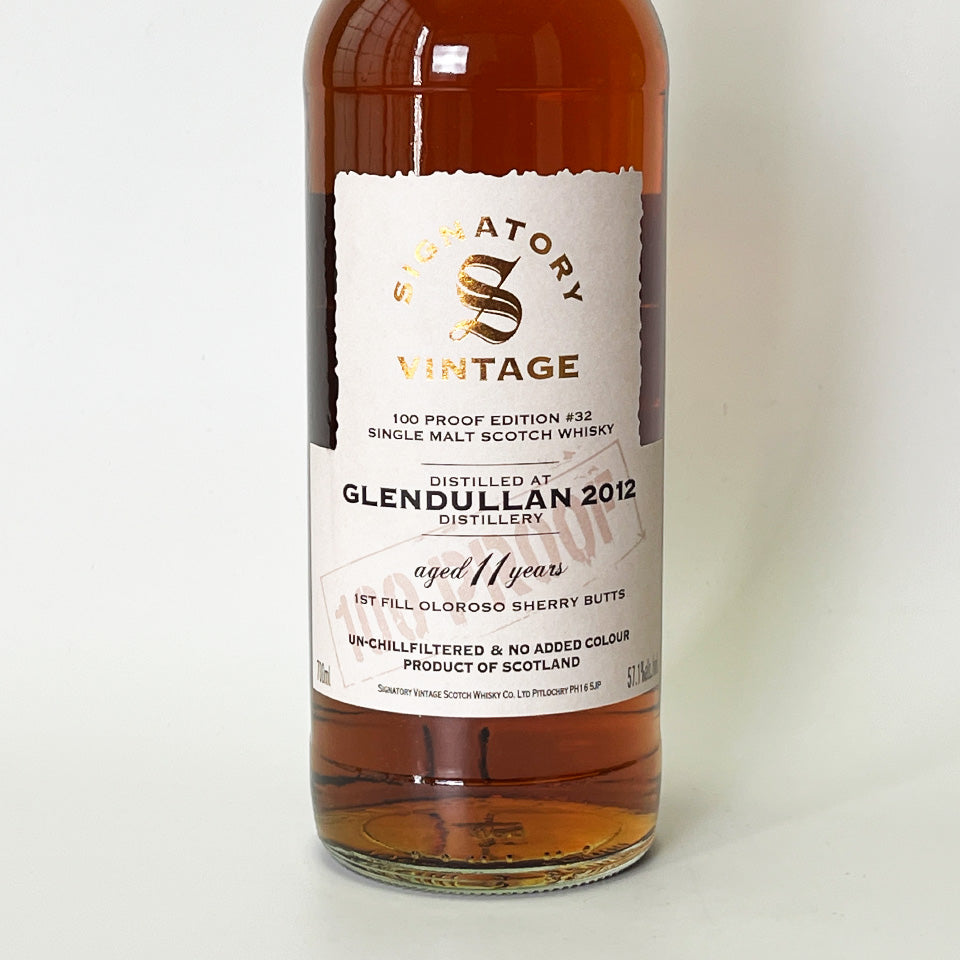 Signatory Vintage 100 Proof Series #32. This collection features malts from Glendallan Distillery in Speyside, bottled at British 100 Proof (57.1% Alc.). This single malt was distilled in 2012 and aged for 11 years in first-fill Oloroso sherry butts. It is non-chill filtered and non-colored.