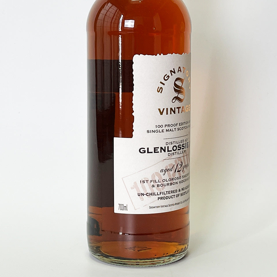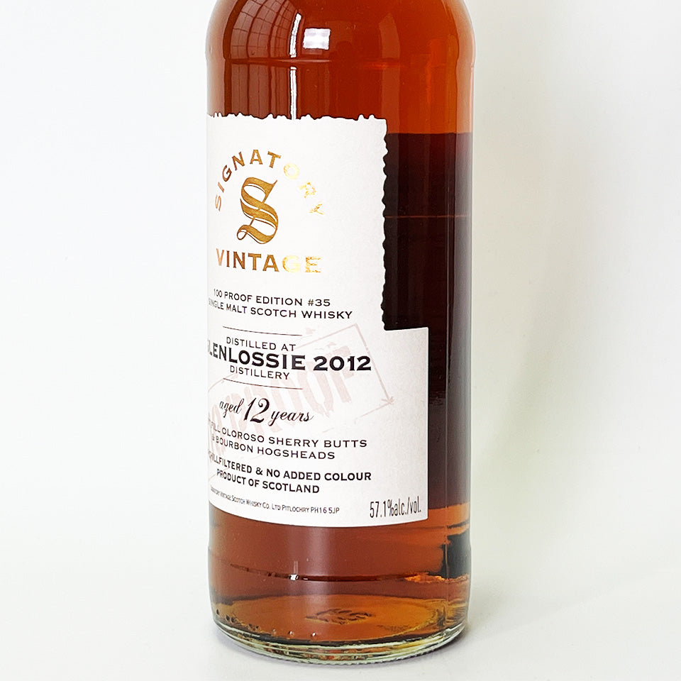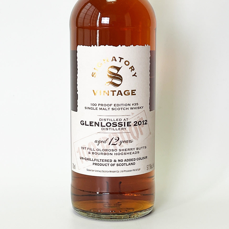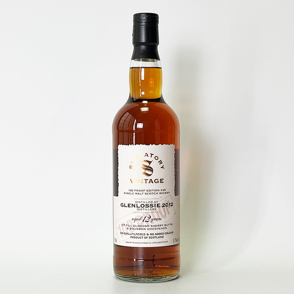 Signatory Vintage 100 Proof Series #35. This collection features malts from Glenlossie Distillery in Speyside, bottled at British 100 Proof (57.1% Alc.). This single malt was distilled in 2012 and then aged for 12 years in first-fill Oloroso sherry butts and bourbon hogsheads. It is non-chill filtered and non-colored.