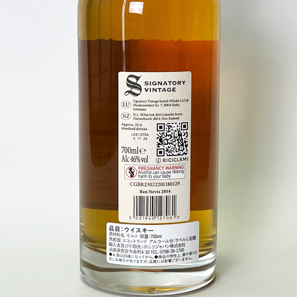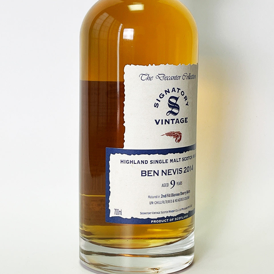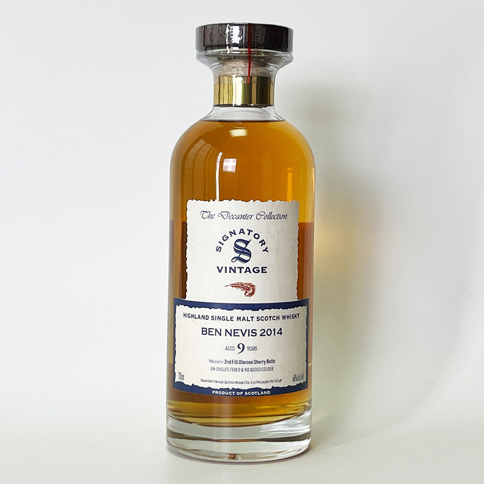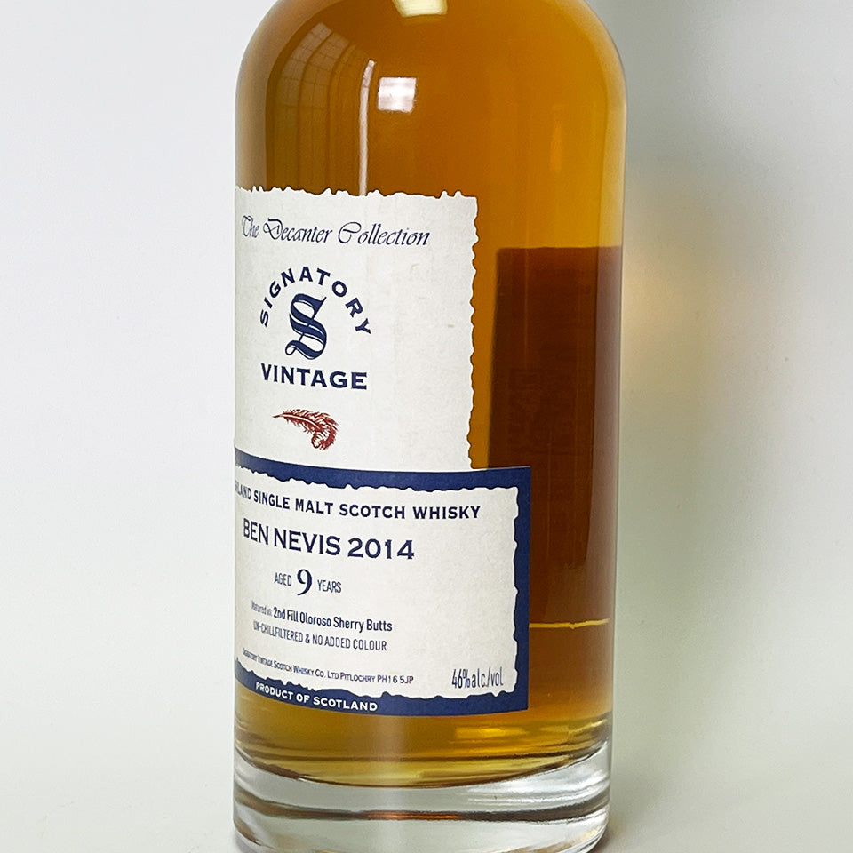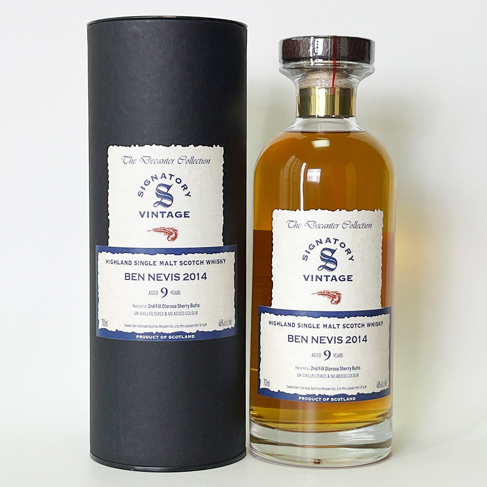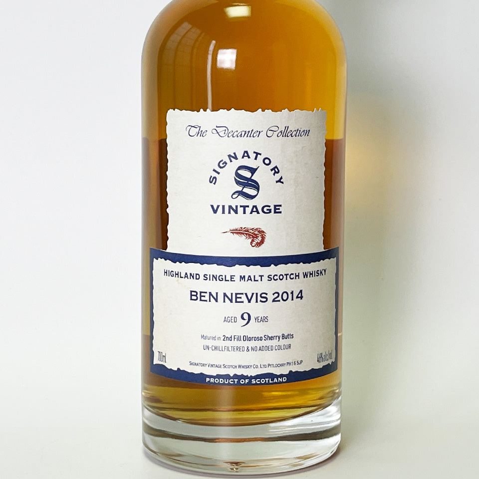 Signatory Vintage is a leading single cask bottling company founded in 1988. This product, part of the Decanter Collection, is a single malt whisky distilled in 2014 at Ben Nevis Distillery (owned by Asahi G) in the Highlands, and aged for nine years in second-fill Oloroso sherry butts.