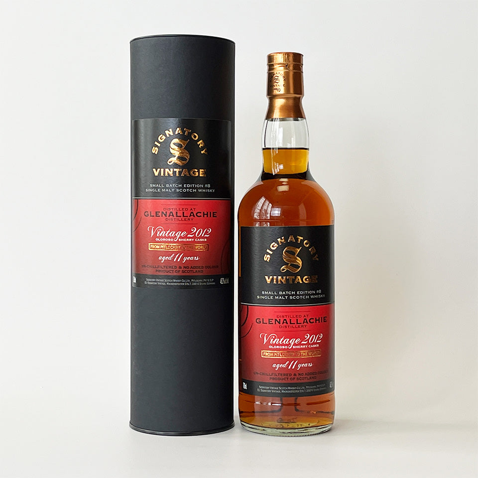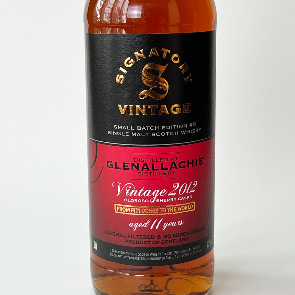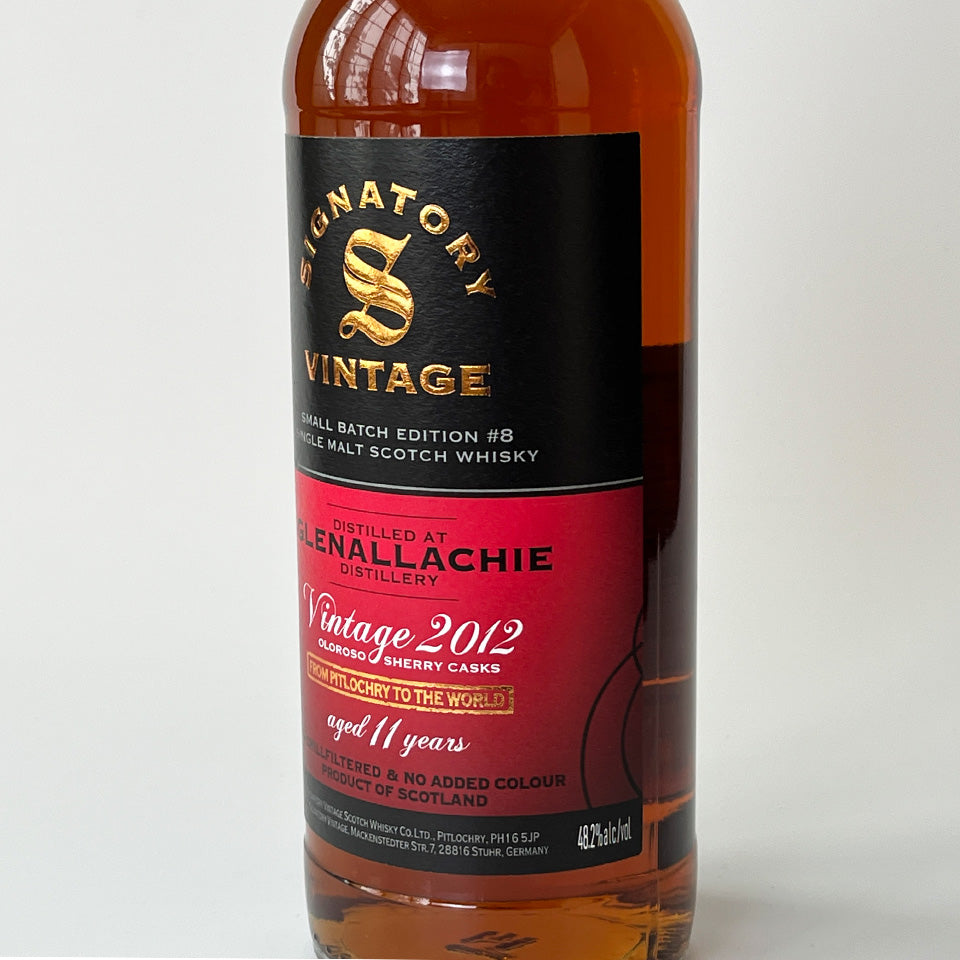 This Small Batch Edition #8 features rare whiskies from Signatory Vintage's holdings. This collection features malts from the Glenallachie distillery in Speyside, bottled unchilled and uncolored. This single malt was distilled in 2012 and aged for 11 years in Oloroso sherry casks.