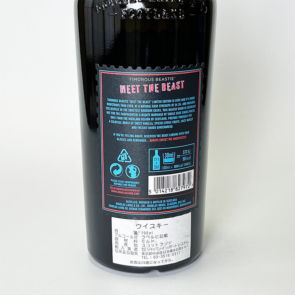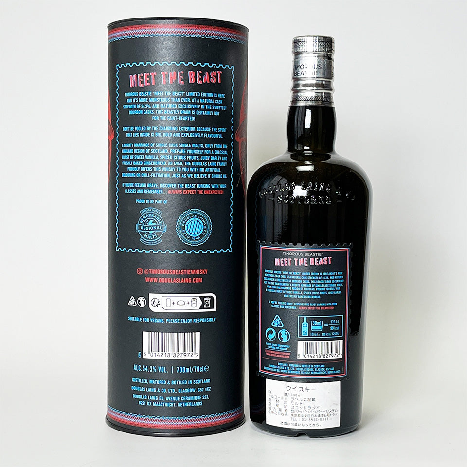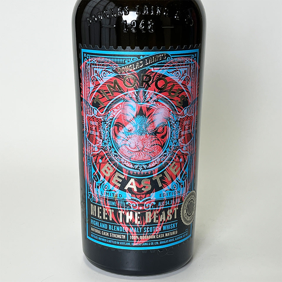 Timorous Beastie Meet the Beast, a limited edition product from major bottler Douglas Laing, features a striking "field mouse" inspired by the work of Robert Burns. It is a blend of single malts from the Highlands, aged in bourbon barrels, and bottled at cask strength without added water.