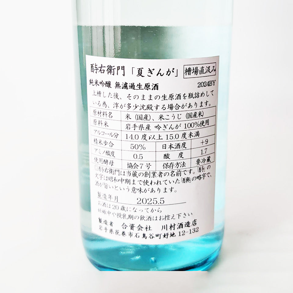 This unfiltered pure rice ginjo sake is made from Iwate Prefecture's "Ginginga," a rice variety derived from "Dewasansan," using 50% polished rice. The alcohol content is kept below 15% for a clean, refreshing taste, making it the perfect unpasteurized sake for summer.