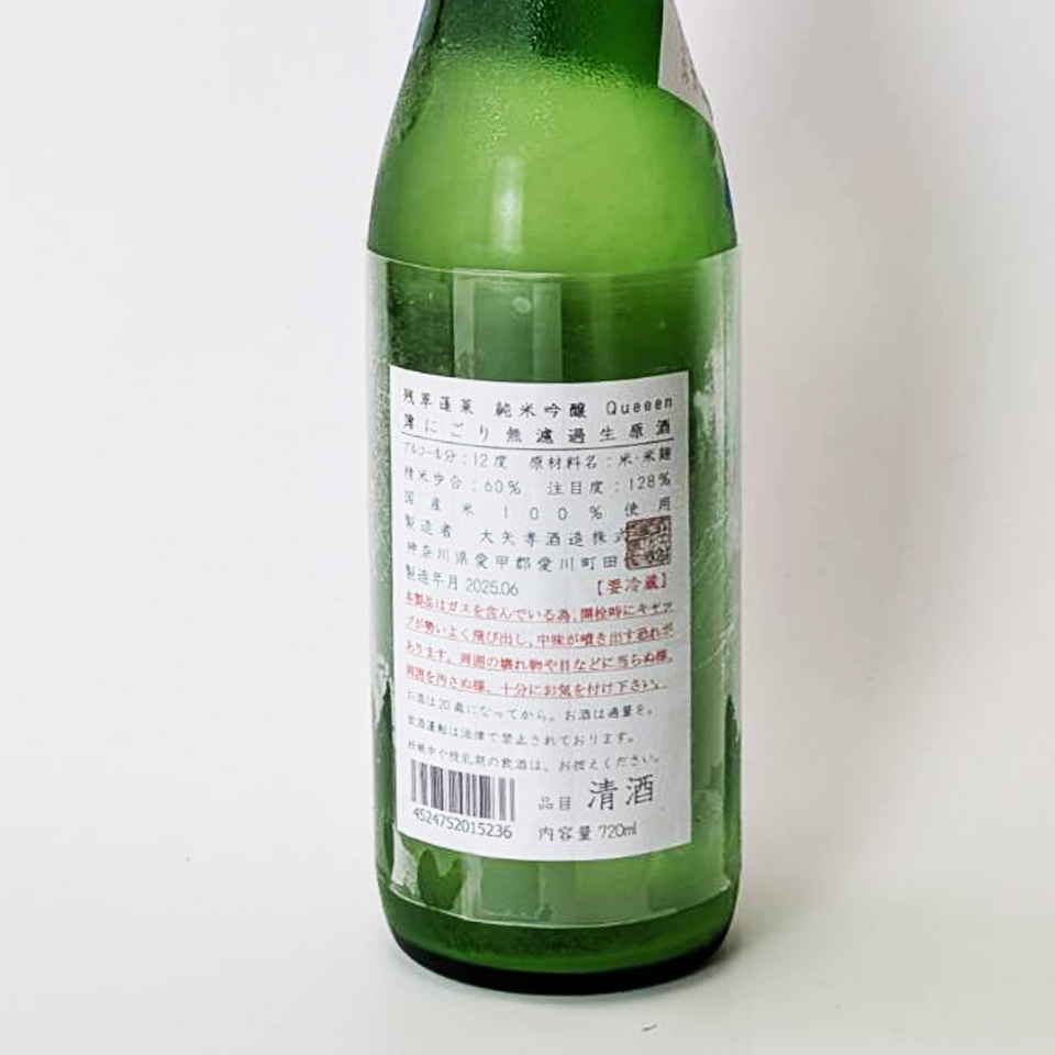 This is a summer-only version of the low-alcohol Junmai Ginjo Queen, a 12% alcoholic sake. This juicy and fresh unpasteurized sake features the refreshing aroma of No. 7 yeast, a scent reminiscent of apples, and a well-balanced acidity and umami flavor. It is made with about 2% lees and undergoes secondary fermentation in the bottle.