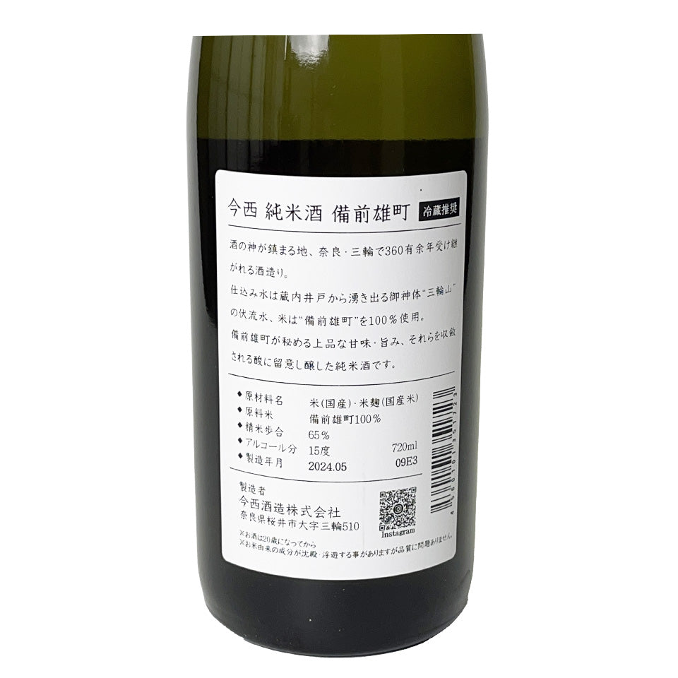 「みむろ杉」をメインブランドとする今西酒造による、限定流通ブランドが「今西」です。ほのかな吟醸香に、雄町ならではの甘味、瑞々しい酸、心地よい余韻を愉しめるお酒です。