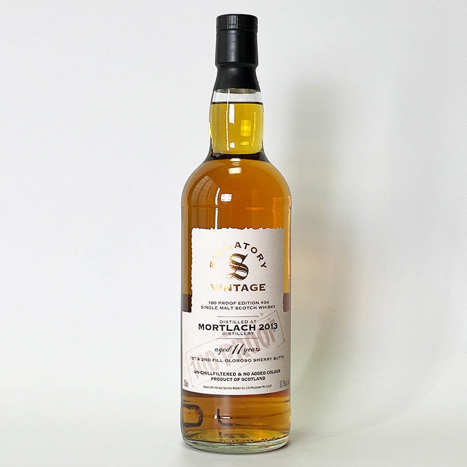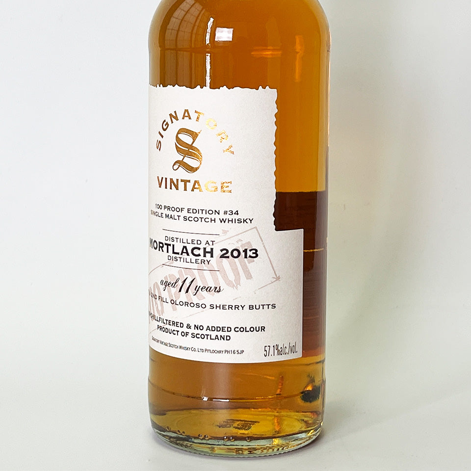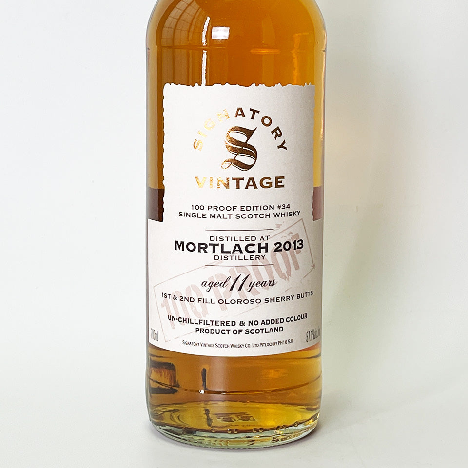 シグナトリー・ヴィンテージの100プルーフ・シリーズ_#34。スペイサイド地方/モートラック蒸留所のモルトを、ブリティッシュ100プルーフ(Alc.57.1%)で瓶詰めしたコレクション。この商品は、2013年に蒸留した後、1stフィルと2ndフィルのオロロソ・シェリーバット(樽)で11年貯蔵したシングル・モルトです。ノン・チルフィルター、ノン・カラード。
