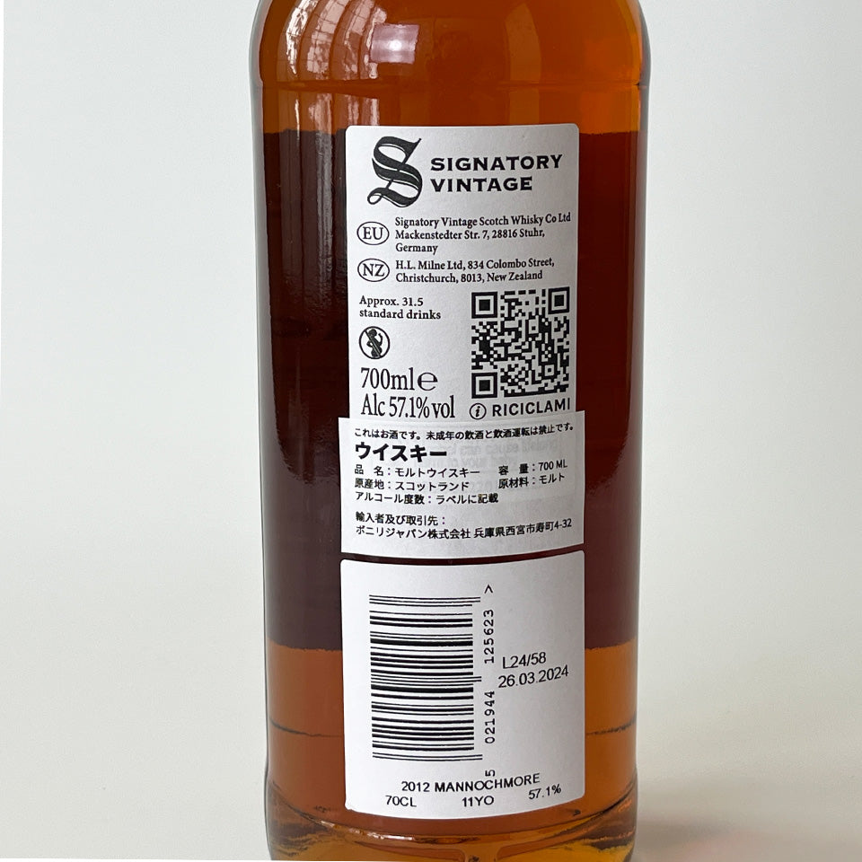 シグナトリー・ヴィンテージの100プルーフ・コレクションシリーズ_#13。スペイサイドにあるマノックモア蒸留所のモルトを、ブリティッシュ100プルーフ(Alc.57.1%)で瓶詰めしたコレクション。この商品は、2012年に蒸留した後、1stフィルのオロロソ・シェリーバット(樽)で11年貯蔵したシングル・モルトです。